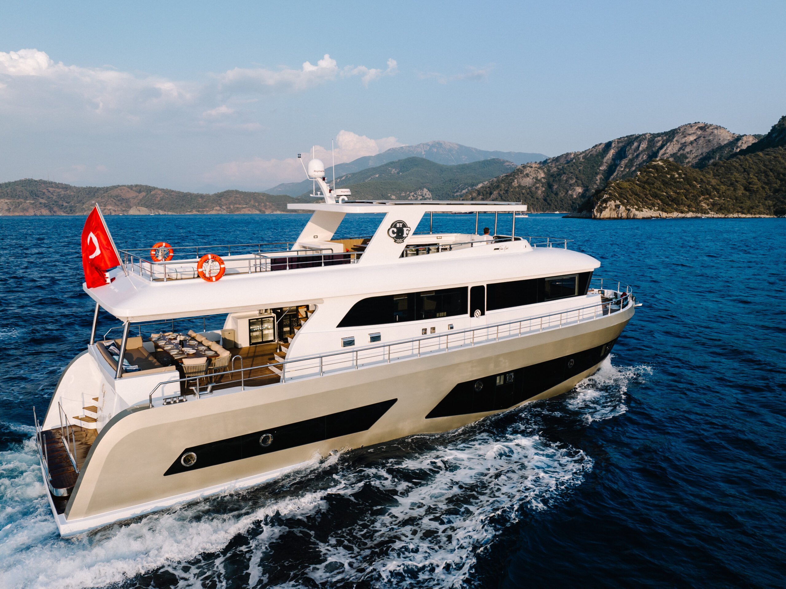 Trawler By C&F is moored in Fethiye harbour and has 4 cabins; 2 masters, 1 triple and 1 twin cabins.